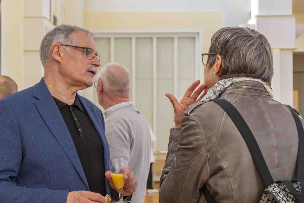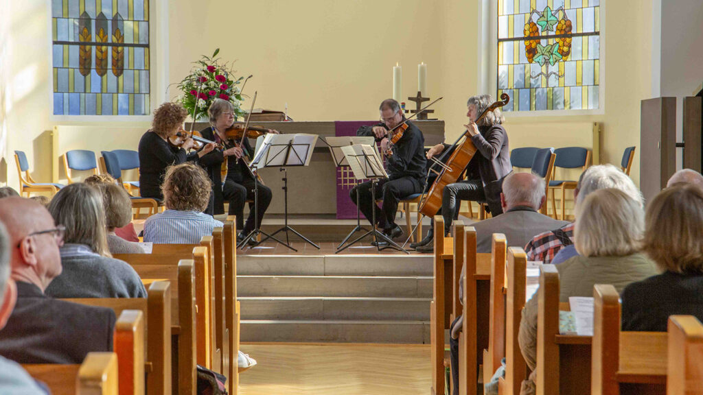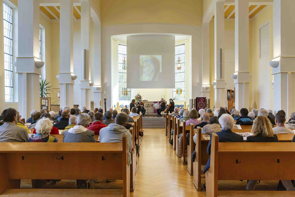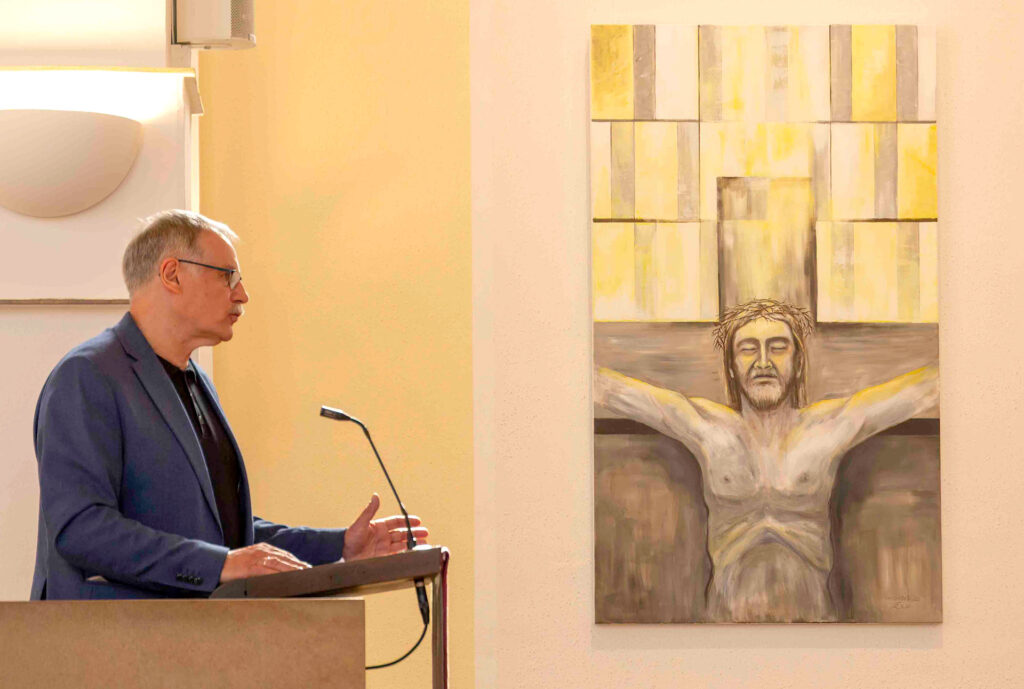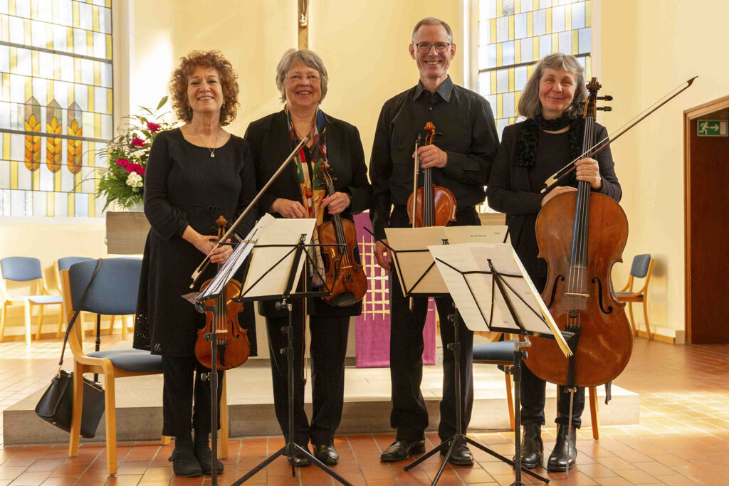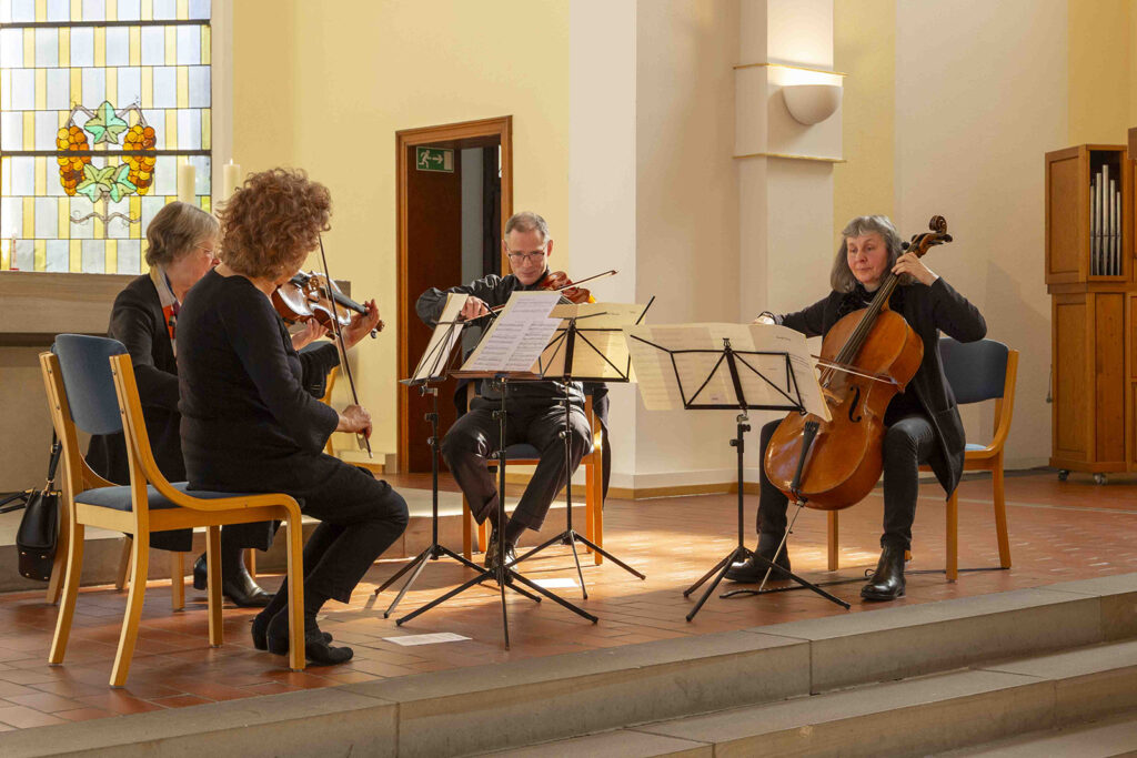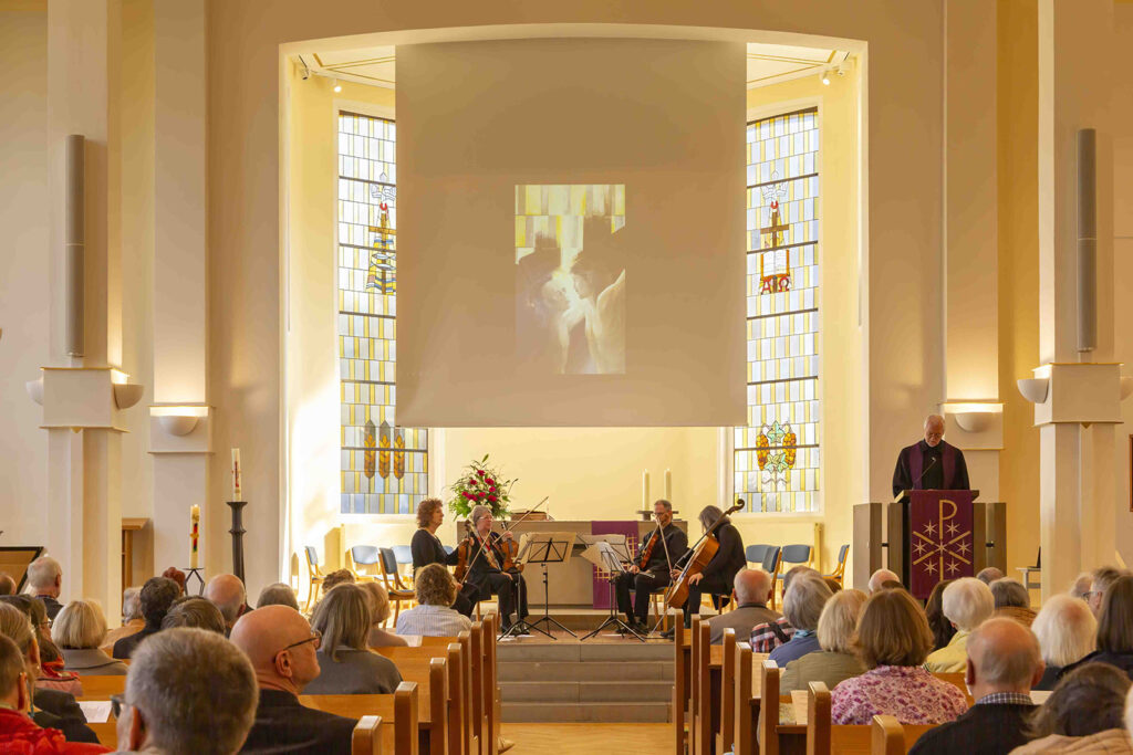 Musikalisch begleitet wurde die Vernissage von Joseph Haydns „Die sieben letzten Worte unseres Erlösers am Kreuze“, interpretiert vom Benedictus Quartett: Rachel Isserlis (Violine), Nicola Borsche (Violine), Armin Behr (Viola) und Barbara Schorling (Violoncello).